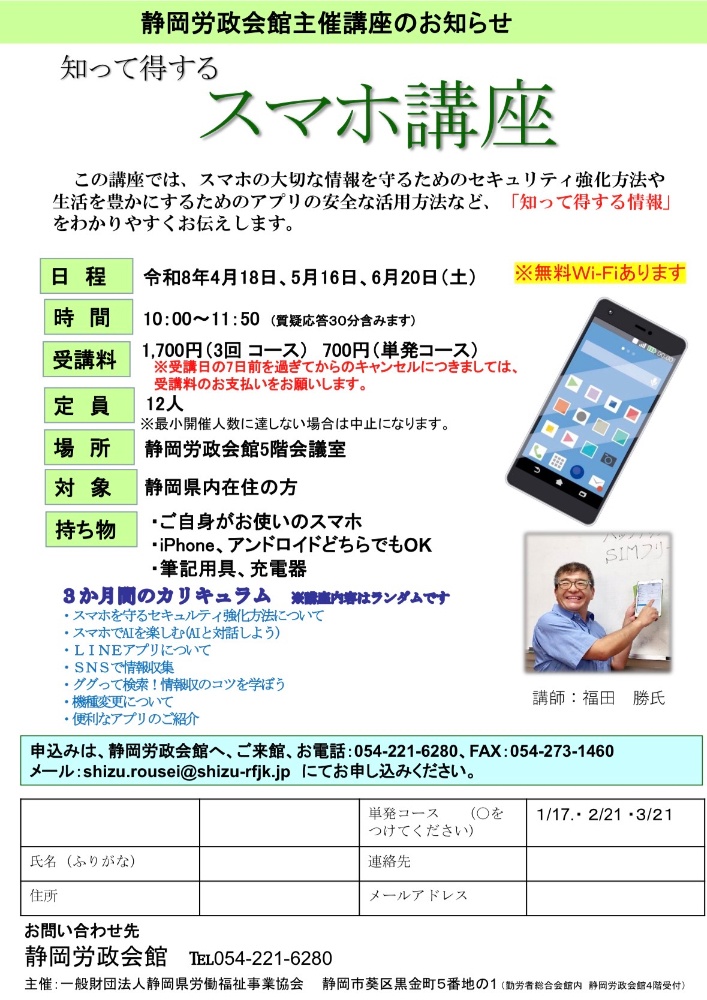 | 持ち物 | ご自身のスマホ(らくらくホンは不可ですがラインが出来る機種は可です) |